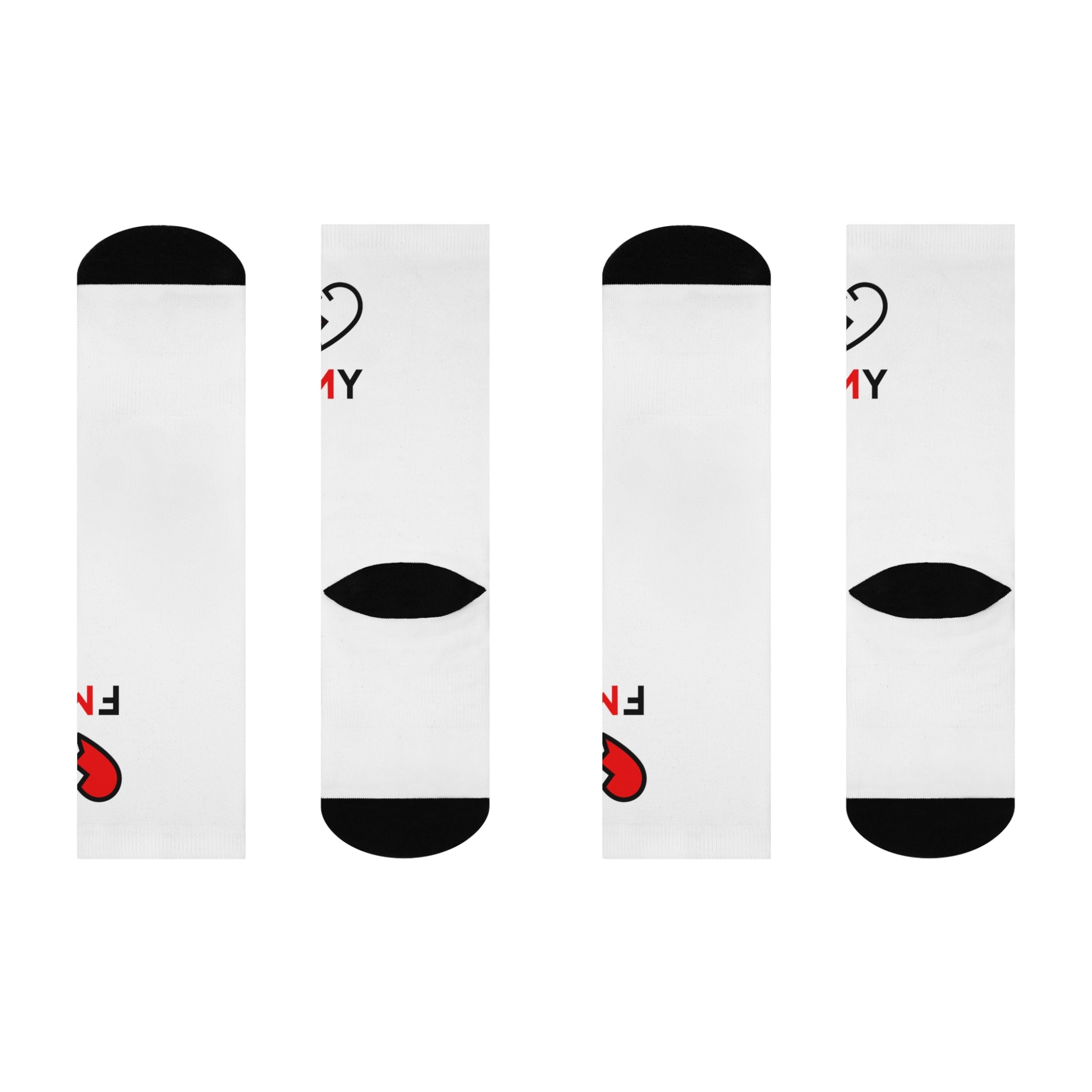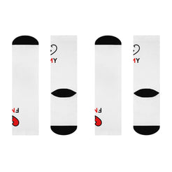 These cushioned DTG crew socks are a one-size style designed with both function and appearance in mind. With the fully cushioned heel-to-toe, these socks provide superior comfort, while the DTG print process allows for ultra-crisp, crease-free printing. Composed of 73% polyester, 18% nylon, 6% spandex, and 3% cotton, these socks are an elevated alternative to the typical sublimation sock and provide a clean, comfortable base for your all-over print designs.